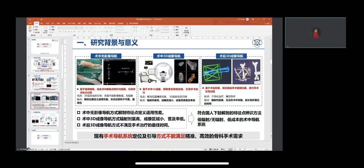 孙教授团队成员进行了进一步的分享。刘传耙博士围绕超声导航骨科手术有关的研究内容进行分享,特别是基于有向自标定患骨配准方法,完成了基于超声的患骨配准过程,并进行了体膜实验,实验结果具有精确性和稳定性,算法运行时间满足临床应用需求。
