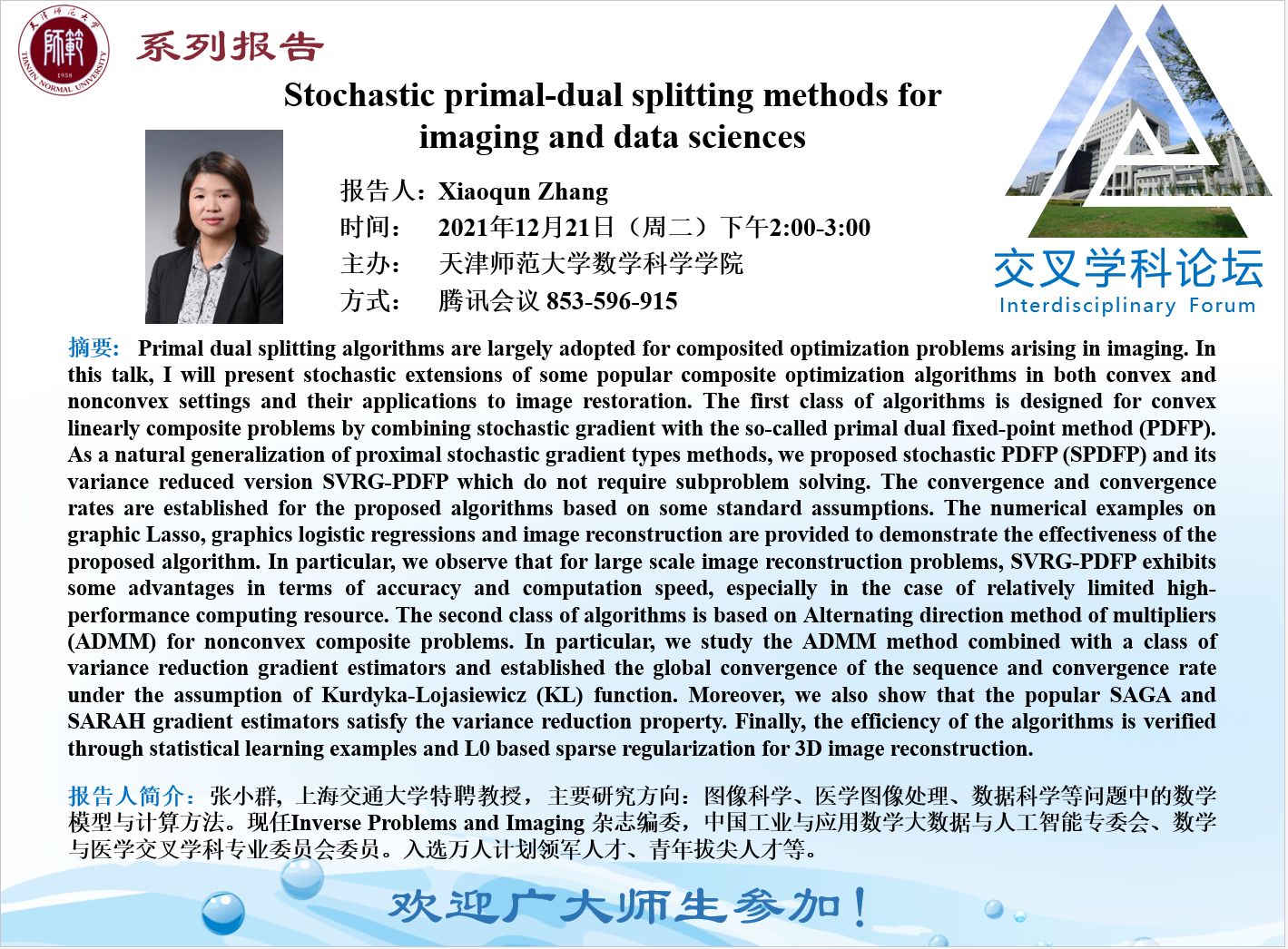 【预告】学术报告(2021-25)12月21日报告——Stochastic primal-dual splitting methods for imaging and data sciences