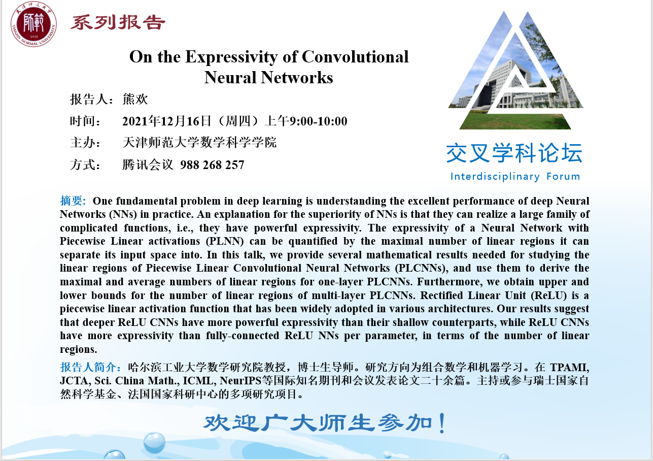 【预告】学术报告(2021-26)12月16日报告——On the Expressivity of Convolutional Neural Networks