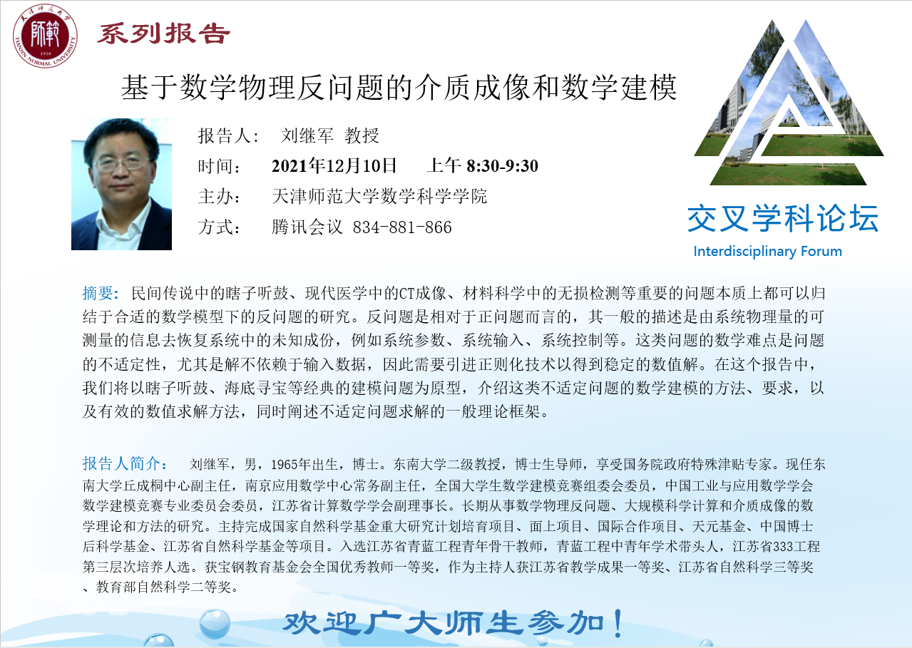 【预告】学术报告(2021-27)12月10日报告——基于数学物理反问题的介质成像和数学建模
