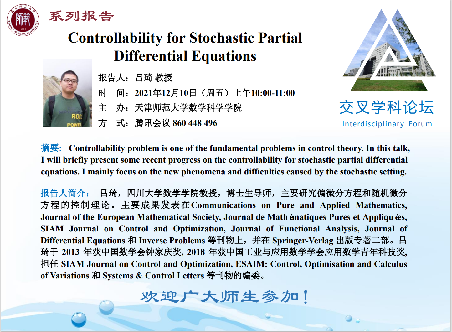 【预告】学术报告(2021-28)12月10日报告——Controllability for Stochastic Partial Differential Equations