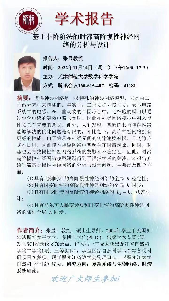【预告】学术报告(2022-17)11月14日报告--基于非降阶法的时滞高阶惯性神经网络的分析与设计