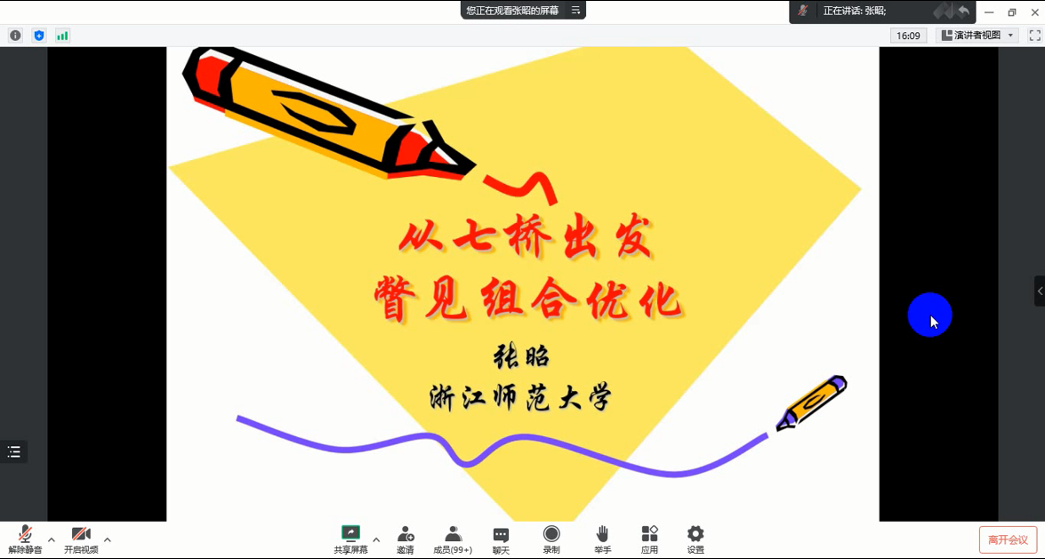 2023年1月9日下午3时,yl6809永利在线上进行了“数学前沿论坛”系列的2023年首场报告。浙江师范大学张昭教授受邀为公司师生带来了题为《从七桥出发,瞥见组合优化》的线上学术报告。公司白学军副董事长和常慧宾副经理主持报告,赵春经理等公司领导、教师、研究生及本科生共140余人共同聆听本场报告。