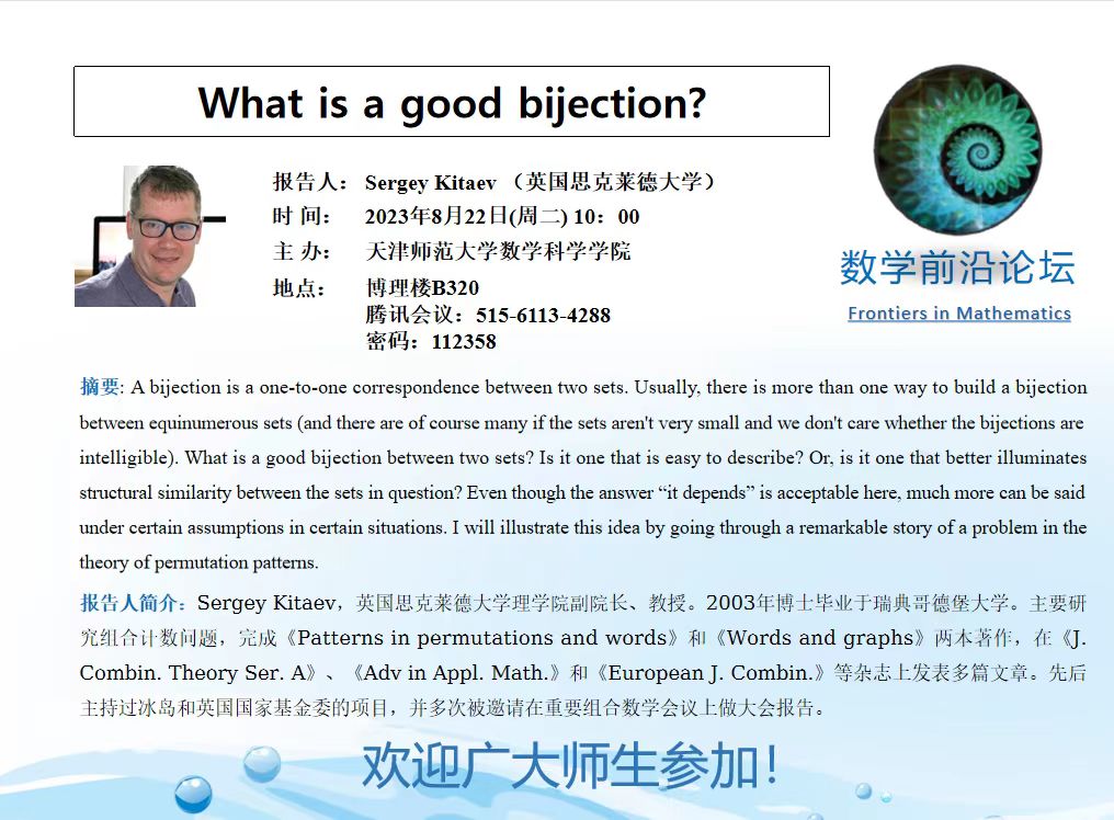 【预告】学术报告(2023-26)8月22日—What is a good bijection?