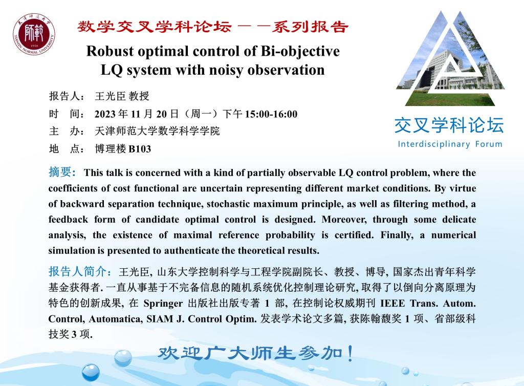 【预告】学术报告(2023-38)11月20日— Robustoptimal control of Bi-objective LQ system with noisy observation