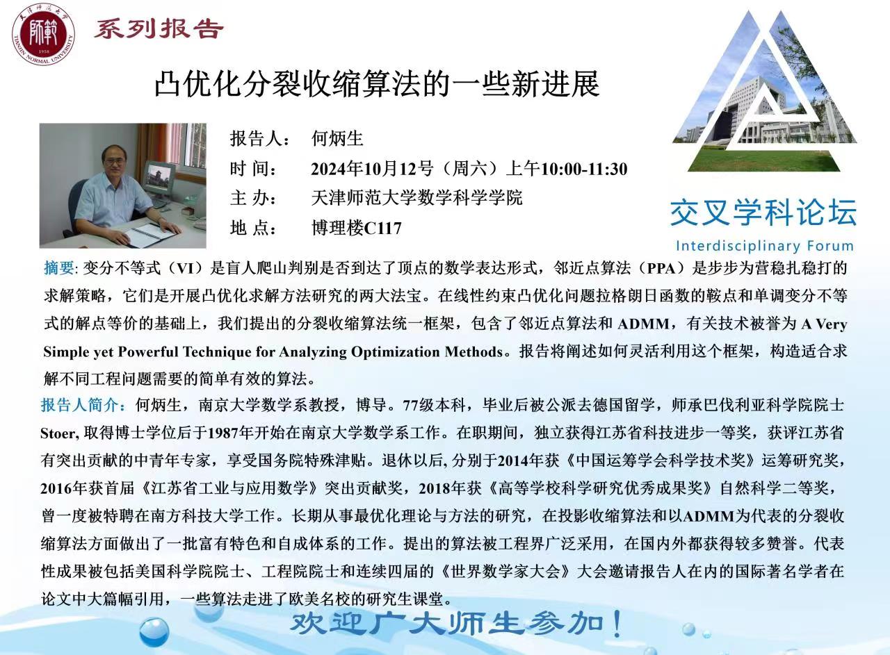 【预告】学术报告(2024-17)10月12日——凸优化分裂收缩算法的一些新进展