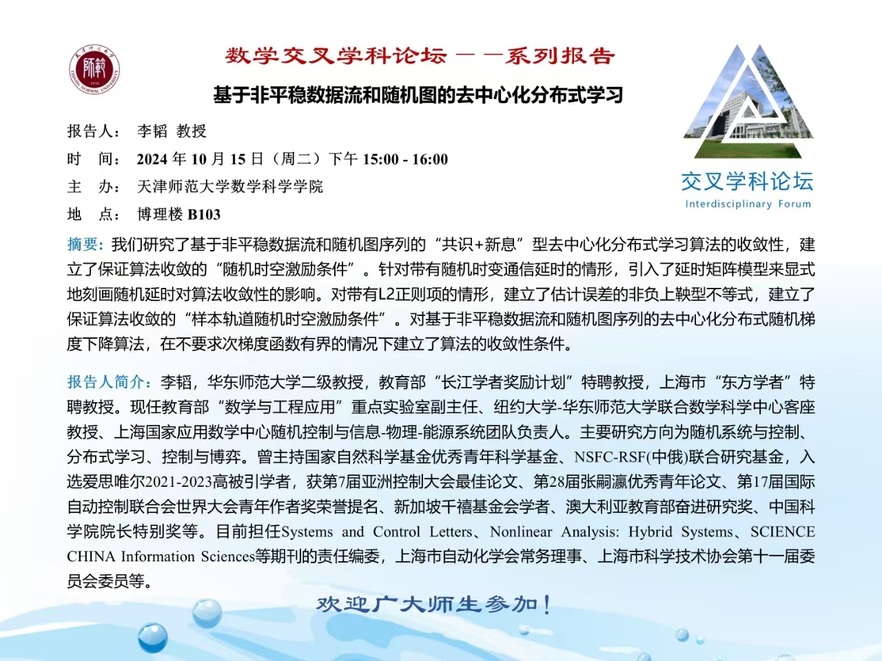 【预告】学术报告(2024-19)10月15日——题目:基于非平稳数据流和随机图的去中心化分布式学习