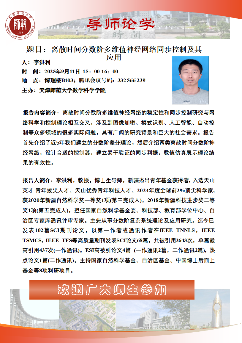 【预告】学术报告(2025-36)9月11日-离散时间分数阶多维值神经网络同步控制及其应用