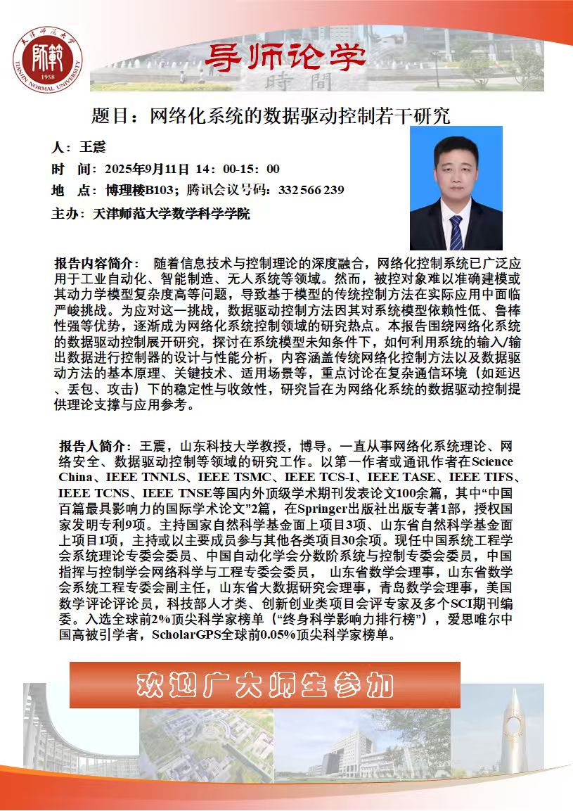 【预告】学术报告(2025-37)9月11日-网络化系统的数据驱动控制若干研究