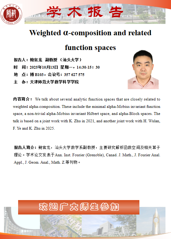 【预告】学术报告(2025-41)10月13日-Weighted α-composition and relatedfunction spaces