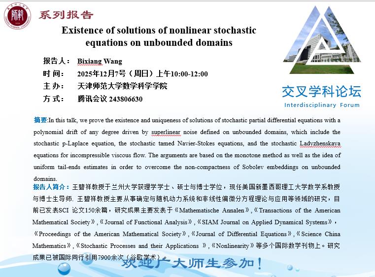 【预告】学术报告(2025-53)12月7日--Existence of solutions of nonlinear stochasticequations on unbounded domains